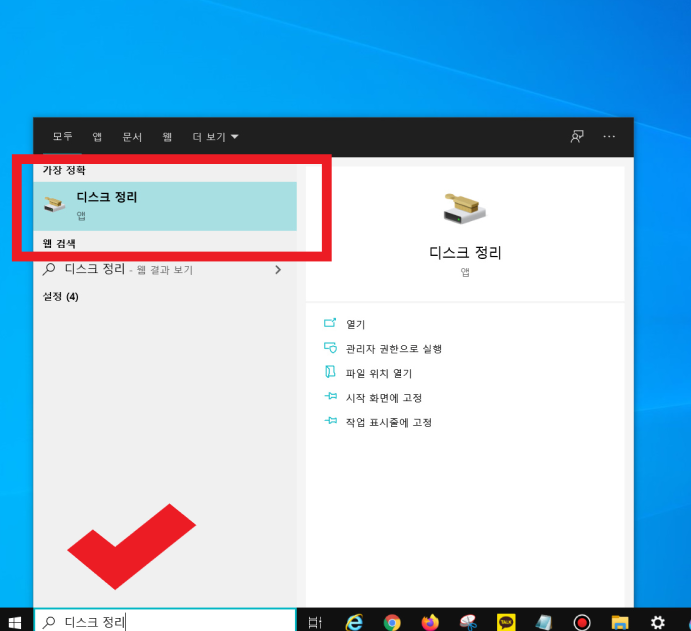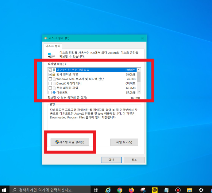 ▼ 바탕화면 좌측 하단에 있는 검색창에 [디스크 정리] 검색 - [디스크 정리] 클릭 - [삭제할 파일]에서 삭제하고자 하는 파일 삭제. 시간 여건이 되면 [시스템 파일 정리]도 해 줄 것. [시스템 파일 정리]의 경우 정리해야 하는 파일이 어느 정도인지에 따라서 30분~1시간 이상 소요가 될 수 있으므로 참고하기 바란다.