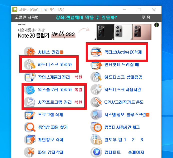 ▼ 고클린에 있는 다양한 항목 가운데 [하드디스크 최적화]와 [익스플로어 최적화], [액티브X 삭제] 그리고 [시작프로그램 관리] 이 4가지 항목만 사용하는 것이 추천된다. 왜냐하면 자칫하다간 더 큰 오류를 일으킬 수 있기 때문이다.