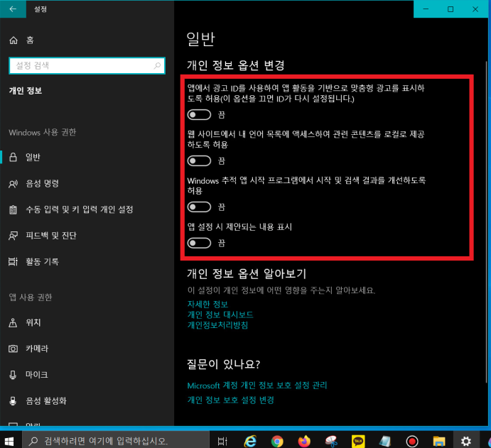 ▼ 바탕화면 좌측 하단에 위치한 [시작 메뉴] 클릭 - [톱니바퀴] 클릭 - [개인 정보] 클릭 - [개인 정보 옵션 변경]에 4가지 '켬' 전부를 '끔'으로 변경