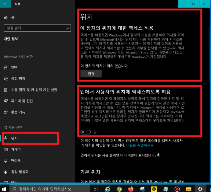 ▼ 위 과정이 끝난 상태에서 좌측 메뉴의 [위치] 클릭 - [이 장치의 위치에 대한 액세스 허용] 아래의 [변경] 클릭 - '켬'을 '끔'으로 변경 - [앱에서 사용자의 위치에 액세스하도록 허용]의 '켬'을 '끔'으로 변경
