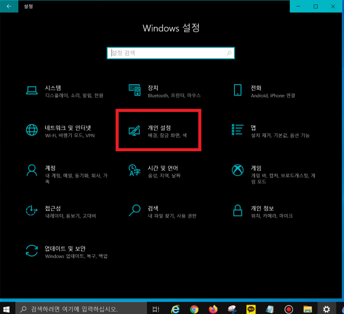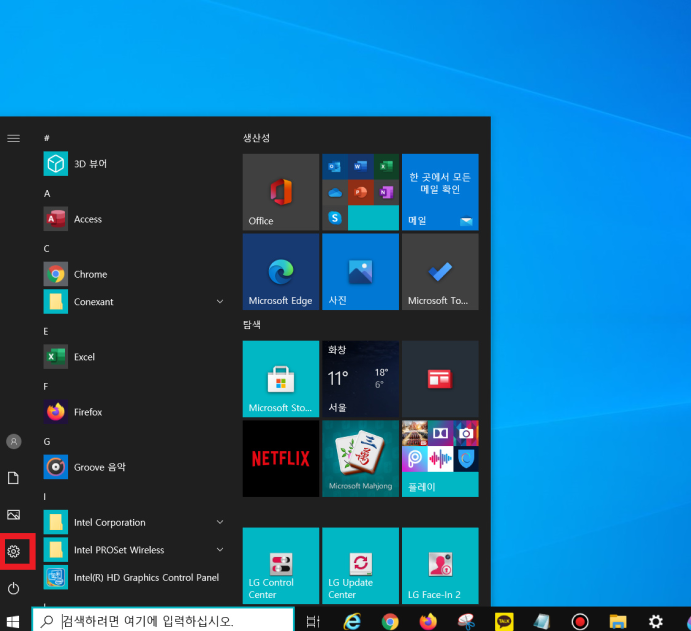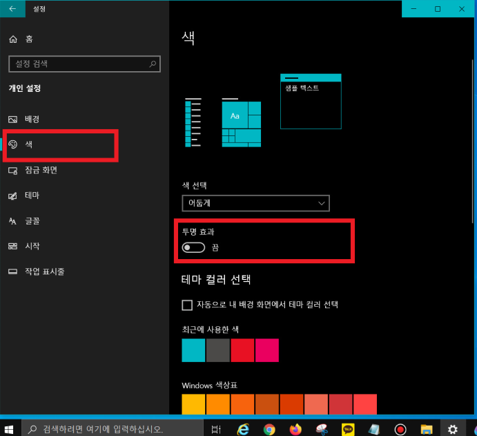 ▼ 바탕화면 좌측 하단 [시작 메뉴] 클릭 - [톱니바퀴] 클릭 - [개인 설정] 클릭 - [색]으로 이동 - [투명 효과] '끔'으로 변경