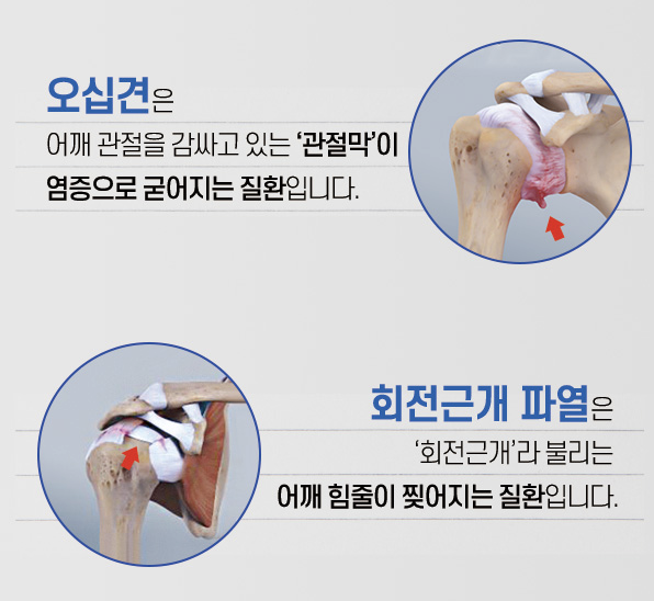 어깨 오십견은 어깨 관절을 감싸고 있는 관절막이 염증으로 굳어지는 질환이다. 어깨 회전근개 파열은 ‘회전근개’라 불리는 어깨 힘줄이 찢어지는 질환이다. 즉, 두 질환은 원인과 발병 부위가 다르므로 각각에 맞는 치료가 필요하다.