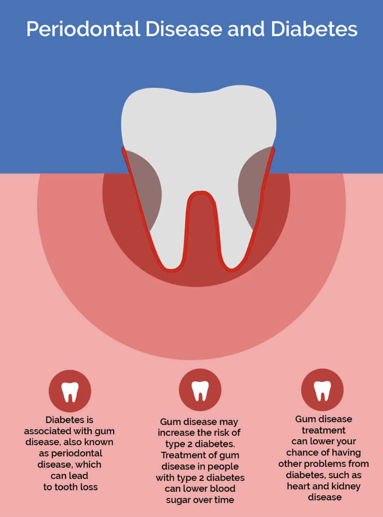 당뇨가 진행되면 몸에 흡수되지 못한 당분이 소변으로 배출되는데, 이때 많은 양의 수분이 빠져나가게 된다. 이로 인해 몸에 수분이 부족해지고 침이 말라 구강 내 세균이 쉽게 번식해 치주질환을 유발할 수 있다. 미국치주학회에 따르면, 당뇨병 환자에서 질병의 감염에 더 민감함에 따라 치주질환 발생 가능성이 더 높다고 밝혔다. 그렇기에 당뇨병 환자의 경우 정기적인 치과 검진을 통해 잇몸 건강을 지키고 당뇨병의 악화를 막아야 한다.