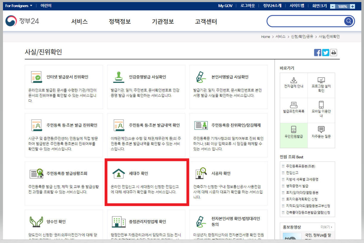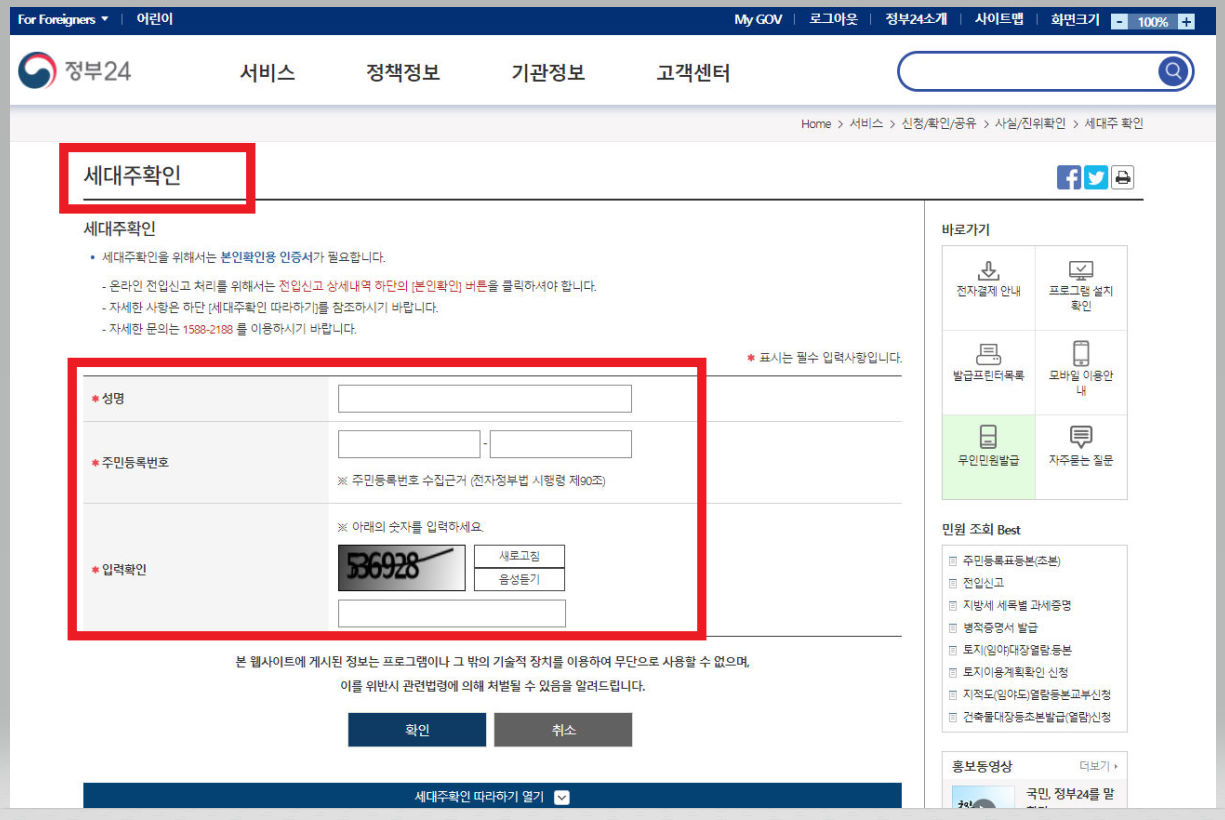 ▼ [사실/진위확인] 메뉴에서 [세대주 확인]을 클릭한다.