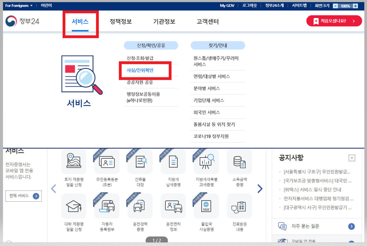 세대주 변경방법 마지막 네 번째 절차! 문자를 확인하였다면, 이번에는 변경 전 세대주가 정부24 홈페이지로 접속을 하여 확인을 해준다. 정부24 홈페이지 상단에 보면 [서비스] 카테고리가 있다. 그곳에서 [신청/확인/공유] 아래 [사실/진위확인]을 클릭한다.