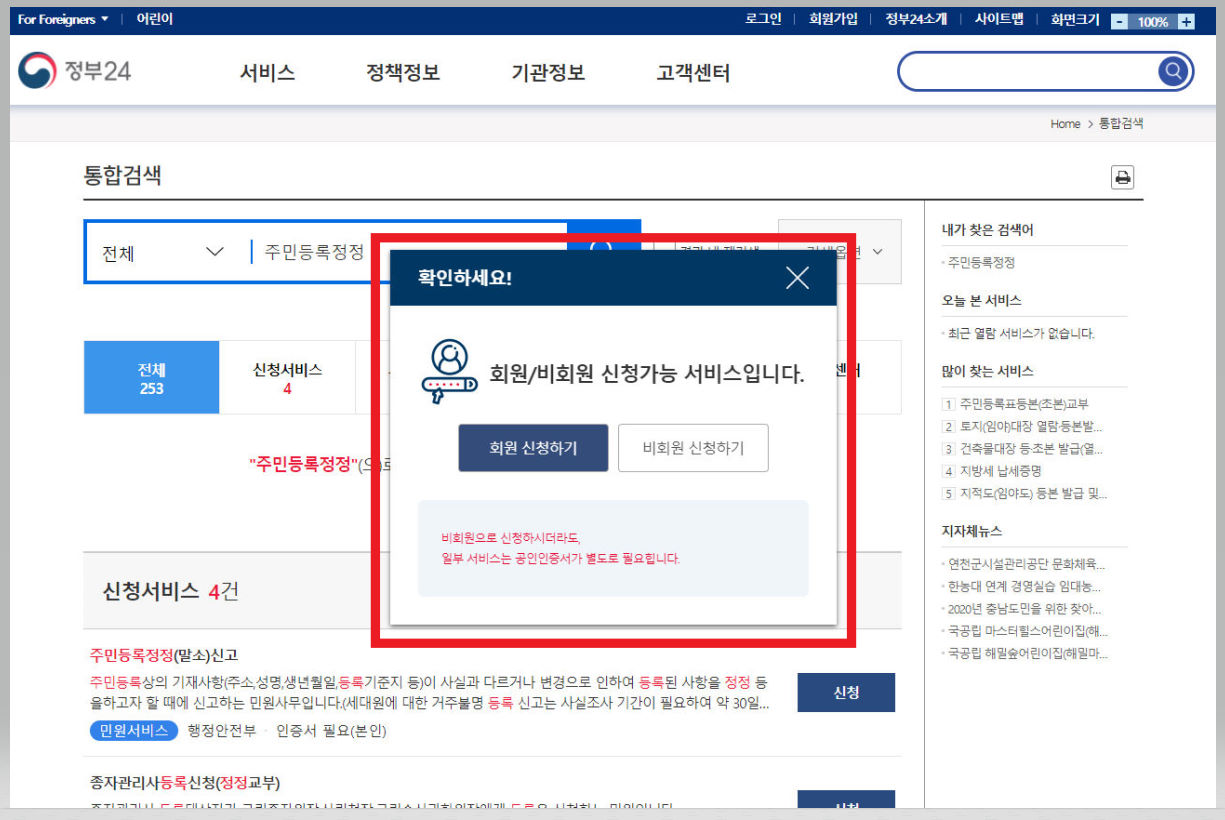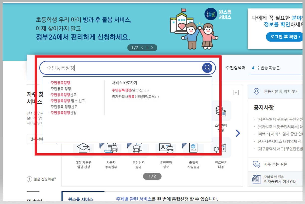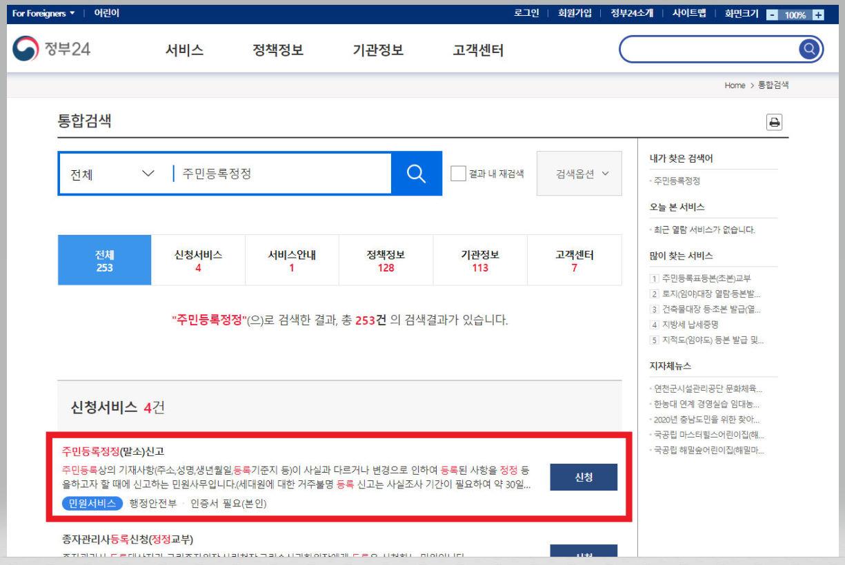 ▼ 정부24 홈페이지 검색창에 [주민등록정정]이라고 검색한다.