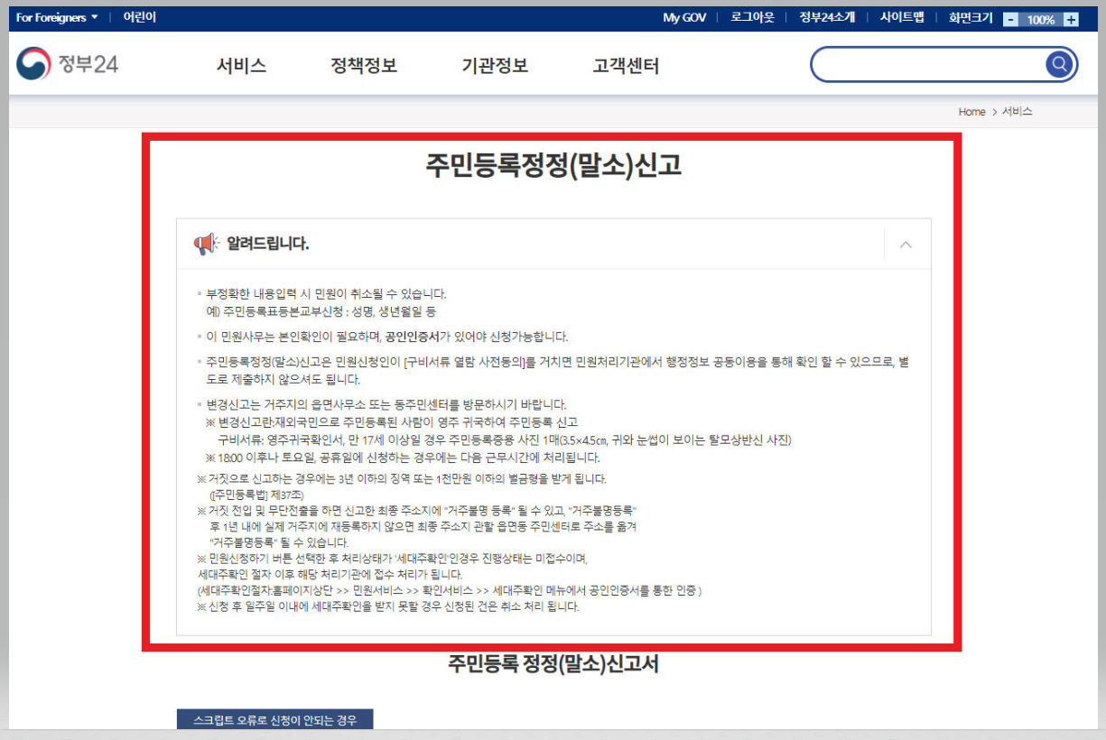 세대주 변경방법 두 번째 절차! 일단 [주민등록정정(말소)신고] 주의사항을 한번 읽어보도록 한다.