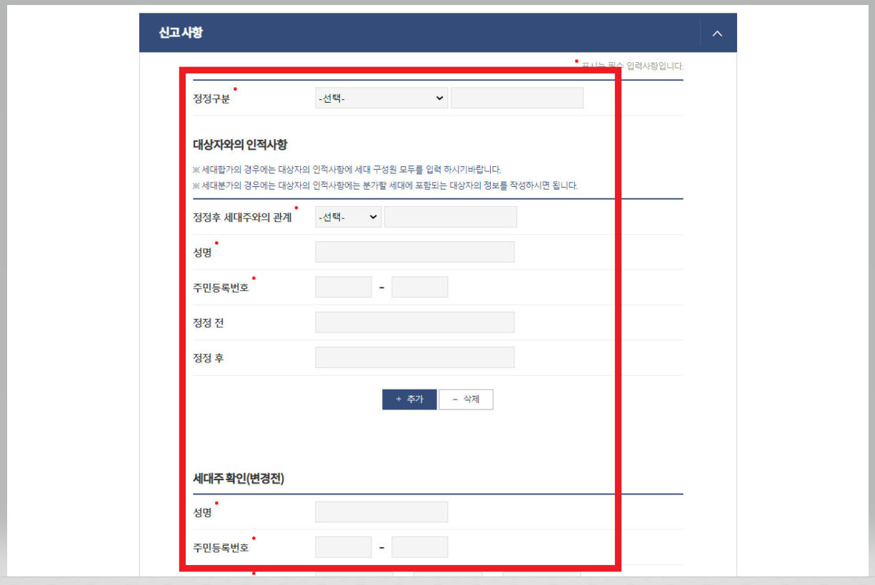▼ [정정구분]은 '세대주 변경'을 선택한다. [정정 후 세대주와의 관계]는 '본인'을 선택한다.