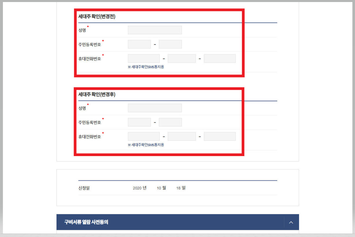 ▼ 그다음 변경 전후의 세대주 확인 사항을 입력해준다. 변경 전 세대주의 성명과 주민등록번호 그리고 휴대전화번호를 입력한 다음 변경 후 세대주의 셩명과 주민등록번호 그리고 휴대전화번호를 입력해준다. 입력한 휴대전화번호로 통지 문자가 전송되므로 번호를 정확히 입력해준다.