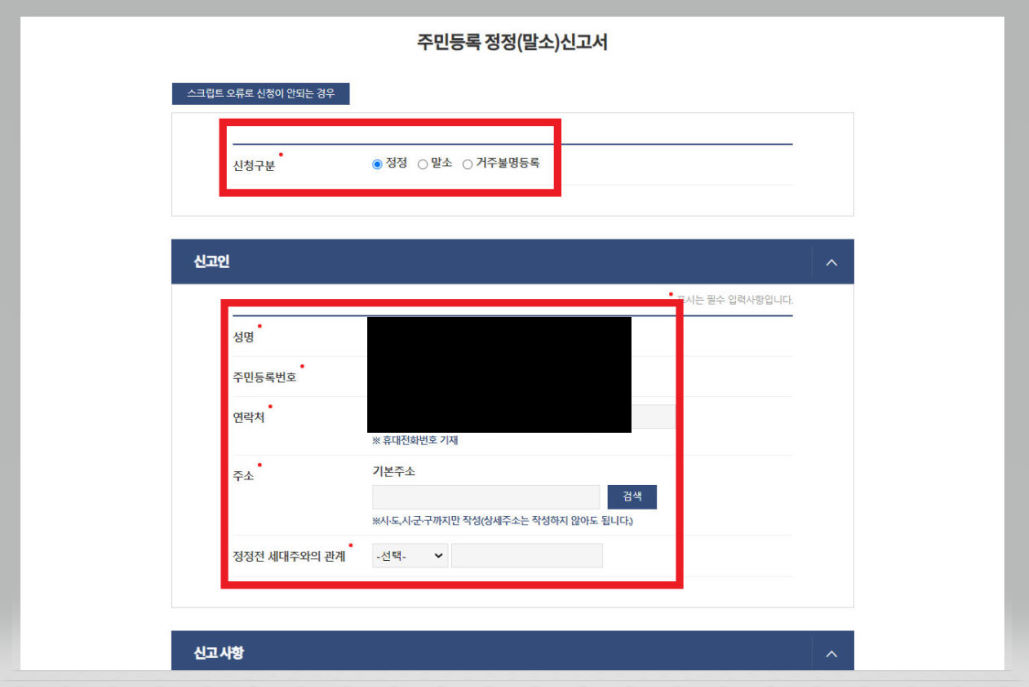 ▼ 그다음 [신청구분]은 '정정'을 체크한다. 그런 다음 [성명]을 비롯한 [주민등록번호], [연락처] 그리고 [주소] 입력란에 신고인의 인적 사항을 입력을 하고, [정정 전 세대주와의 관계]를 선택한다. [정정 전 세대주와의 관계] 선택지는 본인과 배우자, 부, 모, 자녀, 배우자의 자녀, 며느리, 사위, 시부, 시모, 장인, 장모, 형, 제, 누이, 매, 친척, 동거인, 누나 그리고 기타로 구성되어 있다.