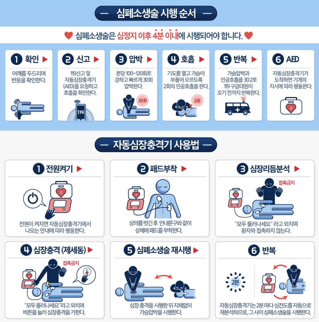 보건복지부 질병관리본부에서는 2015년부터 '한국형 심폐소생술 지침'을 만들고 배포해 올바른 심폐소생술 방법에 대해서 안내하고 있다. 지침에 따르면 심정지 의심 환자가 발생하면 가장 먼저 의식과 호흡을 확인하고, 주변에 119 신고 및 자동 제세동기(Automated external defibrillator, AED)를 요청해야 한다. AED의 사용법은 다음과 같다.