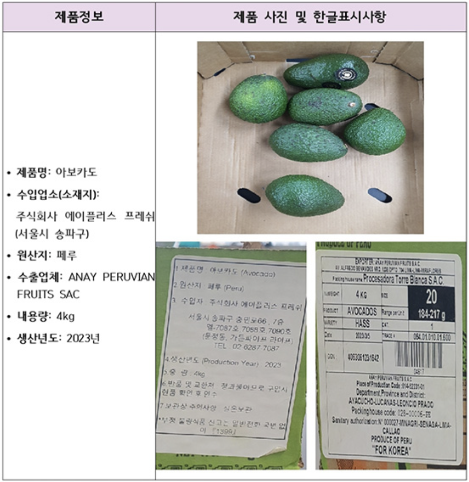 회수 대상 제품은 올해 페루에서 생산돼 주식회사 '에이플러스 프레쉬'가 국내로 들여온 아보카도로 4kg 단위로 묶여 시중에 팔리고 있습니다.
