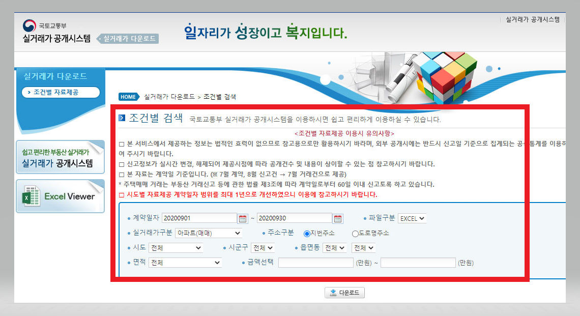 ▼ 조회하고자 하는 곳의 계약일자와 실거래가구분, 주소, 면적 그리고 금액 등을 입력한 다음 하단에 있는 [다운로드] 버튼을 클릭해준다. 그런 다음 화면에 뜨는 [보안번호]를 입력하여 인증을 해주면, 자동으로 엑셀 파일이 다운로드가 된다. 해당 파일을 열어보면 선택한 기간과 상세 정보 등과 일치하는 내용이 저장되어 있음을 확인할 수가 있다.