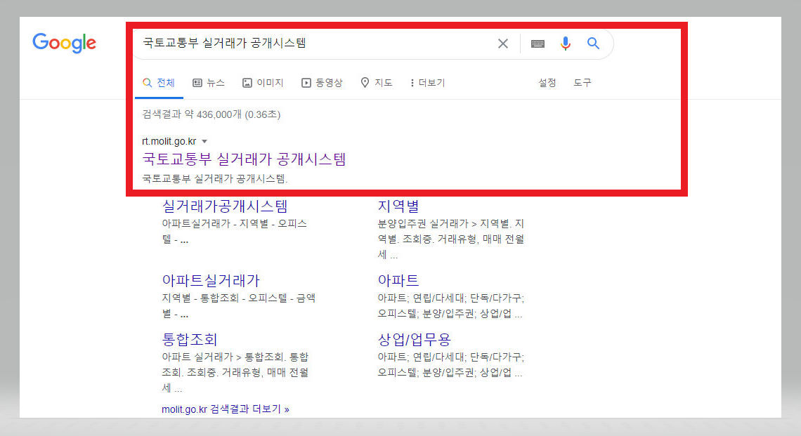아파트 실거래가 조회를 하기 위하여서는 우선 검색포털에서 [국토교통부 실거래가 공개시스템]을 검색하여 접속한다.