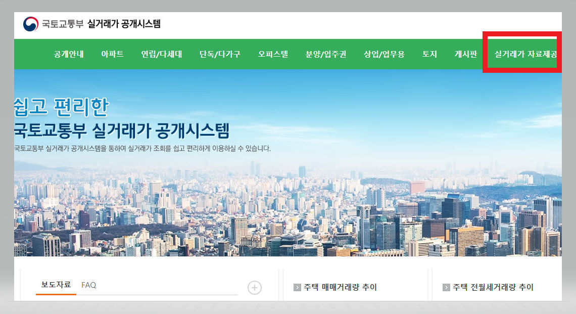 ▼ 본인이 조회한 내역을 엑셀 파일로 다운로드를 받고자 하는 경우에는 다시 [국토교통부 실거래가 공개시스템] 홈페이지로 돌아와 페이지 상단의 [실거래가 자료제공] 버튼을 클릭해준다.