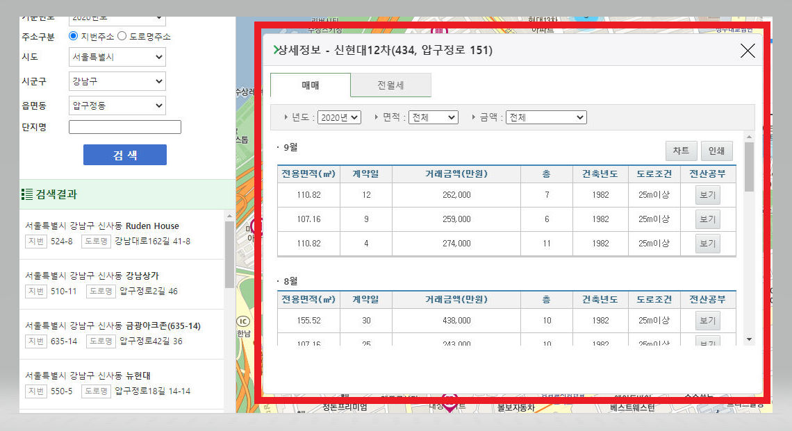 ▼ 조회하고자 하는 곳을 마우스를 통해 클릭을 해주면 매매 및 전월세 거래내역을 확인을 할 수 있다.