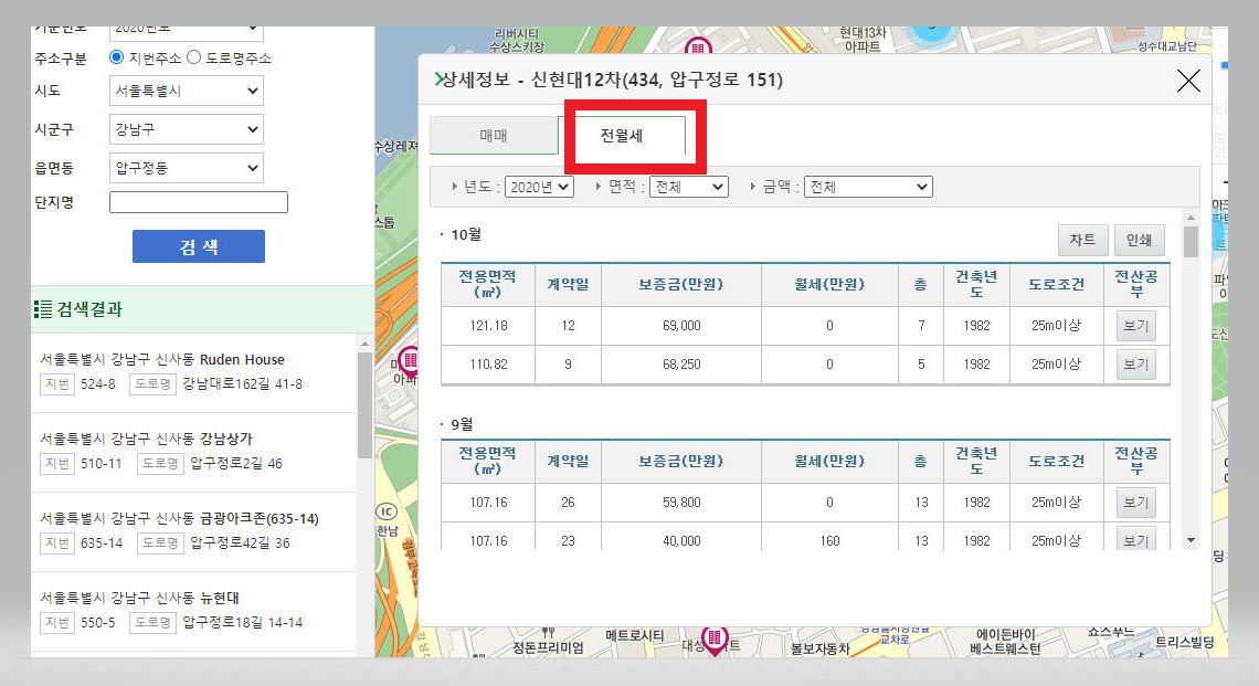 ▼ 조회 시 매매가가 궁금하면 [매매] 버튼을 클릭해주고, 전월세 가격이 궁금하면 [전월세] 버튼을 클릭해준다. 연도나 면적 혹은 금액 등을 설정해서 조회를 하면 보다 구체적이고 상세한 내용을 확인해볼 수 있다.