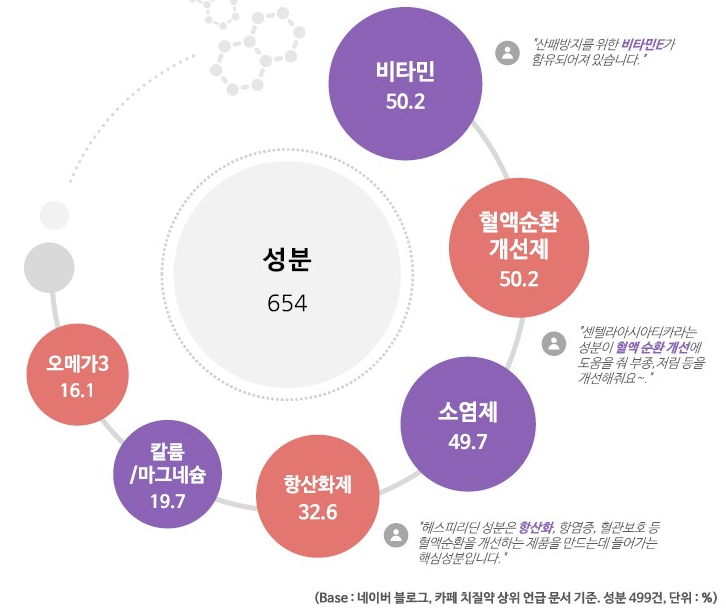 성분에 대한 부분을 살펴보면, 비타민과 혈액순환 개선제에 대한 언급이 가장 많은 것으로 확인됐다. 주로 산패 방지에 도움이 된다고 알려진 비타민 함유 제품에 대한 선호도가 높았으며 소염제와 콜레스테롤의 산화를 억제하는 항산화제 또한 많이 언급됐다.