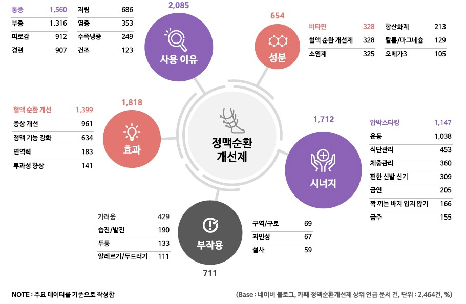 우선 정맥순환 개선제의 연관어를 살펴보면 '사용 이유'가 가장 주요한 관심사였다. 총 2085건이 검색됐으며 통증(n=1560), 부종(n=1316), 피로감(n=912), 경련(n=907), 저림(n=686), 염증(n=353) 순으로 높았다.