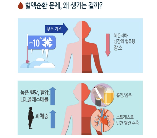 '혈액순환에 좋은 음식, 식단, 식이요법' 포스팅을 시작해보도록 하겠다. 날씨가 추워지면 혈액순환 장애가 생기기 쉽다. 우리 몸의 체온이 떨어지면 혈관 수축으로 심장의 혈류량이 떨어져 혈액의 순환이 원활하지 않게 된다. 혈액은 우리 몸의 각 조직으로 산소와 영양분을 공급하고, 세포의 노폐물을 제거하기 때문에 혈액순환에 장애가 생기면 여러 질병이 유발되기 쉽다.