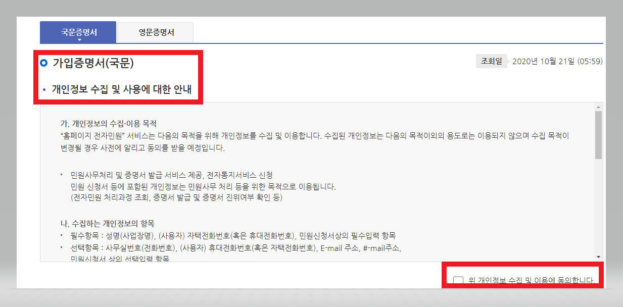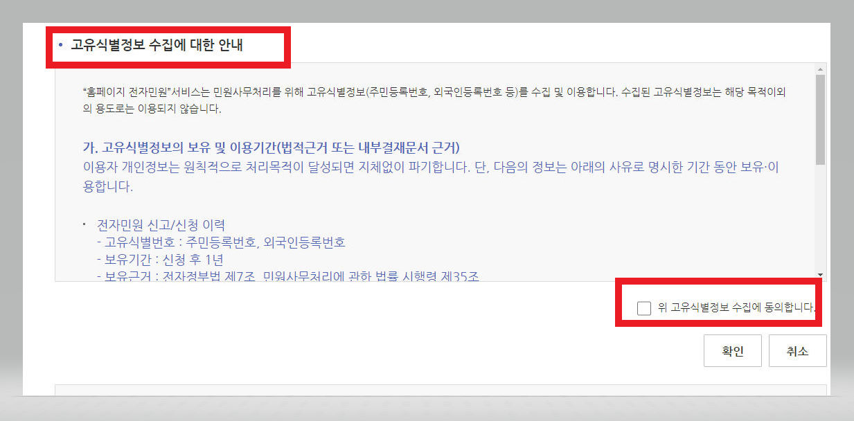 ▼ 그 아래에는 [고유식별정보 수집에 대한 안내]가 뜨고, 그에 대한 동의 절차 역시 필요하다.
