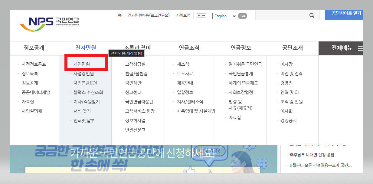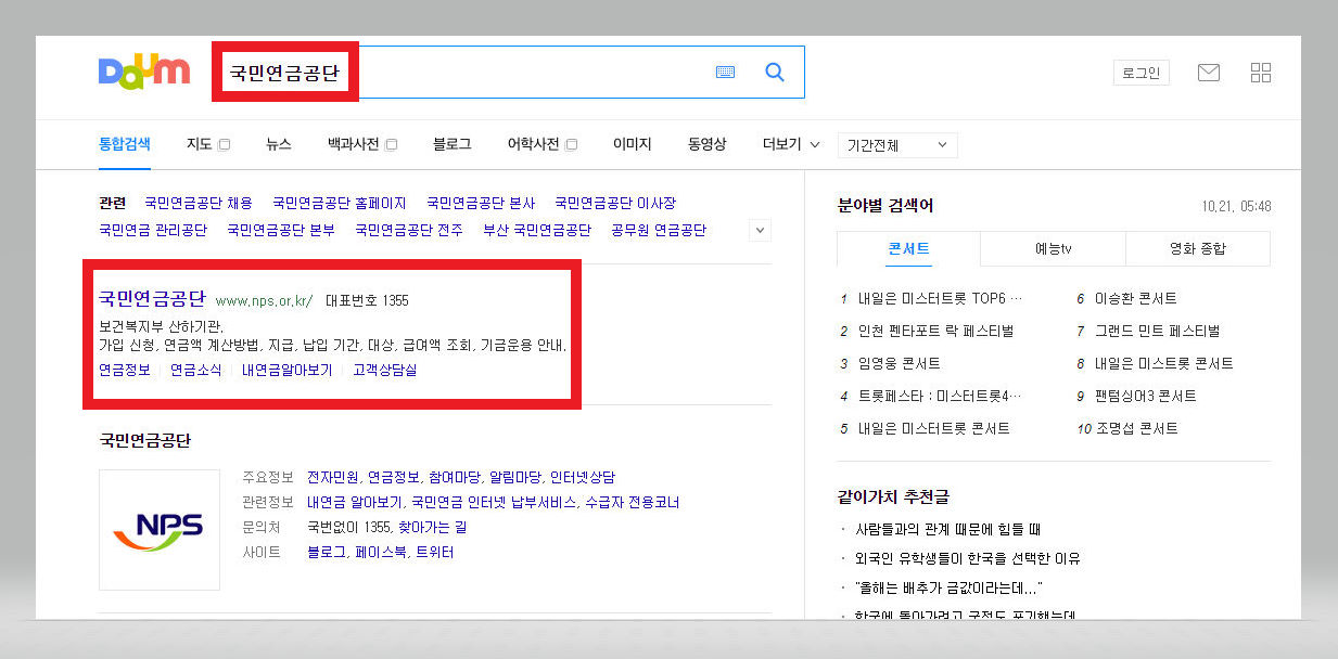 우선 다음이나 구글 혹은 네이버 등의 검색포털에 접속하여 검색창에 [국민연금공단]을 검색한다. 그러면 [국민연금공단]의 홈페이지가 뜰 텐데, 클릭하여 접속해준다.