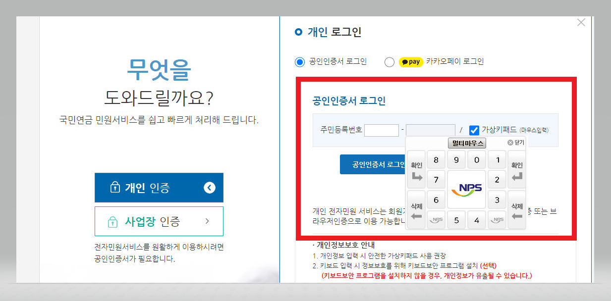 ▼ [주민등록번호]를 입력해줌으로써 [공인인증서 로그인] 절차를 밟아준다. 키보드 보안 프로그램을 설치한 덕분인지 아래 화면을 보면 주민등록번호 뒷자리를 입력하는 과정은 키보드가 아닌 마우스를 사용하여 입력하도록 하는 창이 하나 뜨는 것을 확인할 수가 있다.