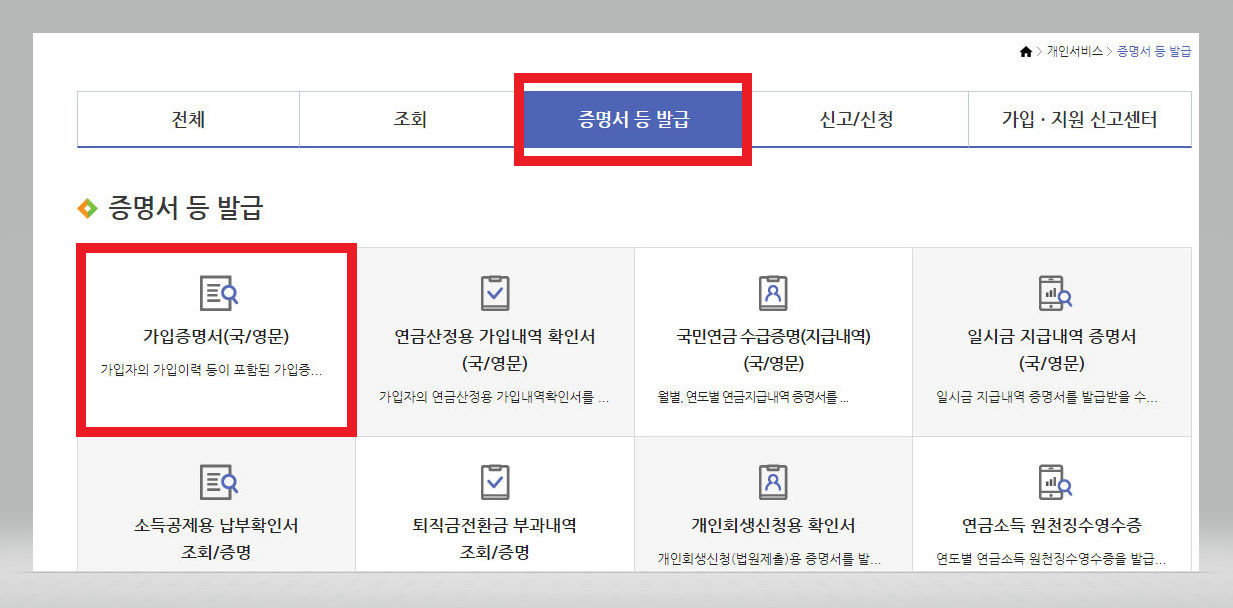 ▼ 조금 내려와서 [증명서 등 발급] 메뉴를 클릭해준다. 그다음 [가입증명서(국/영문)] 버튼을 클릭해준다.