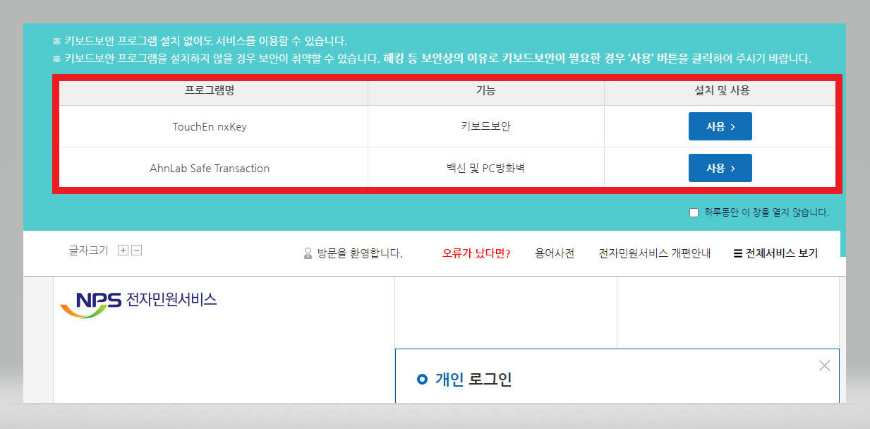 ▼ 그렇게 해서 들어오면 [키보드보안 프로그램 설치] 팝업창이 뜨는데 [TouchEn nxKey]나 [AhnLab Safe Transaction] 중 아무거나를 선택하여 설치해주도록 한다. 설치는 우측에 [사용] 버튼을 클릭해주면 진행이 된다. 나의 경우는 그냥 [TouchEn nxKey]를 설치해주었다.