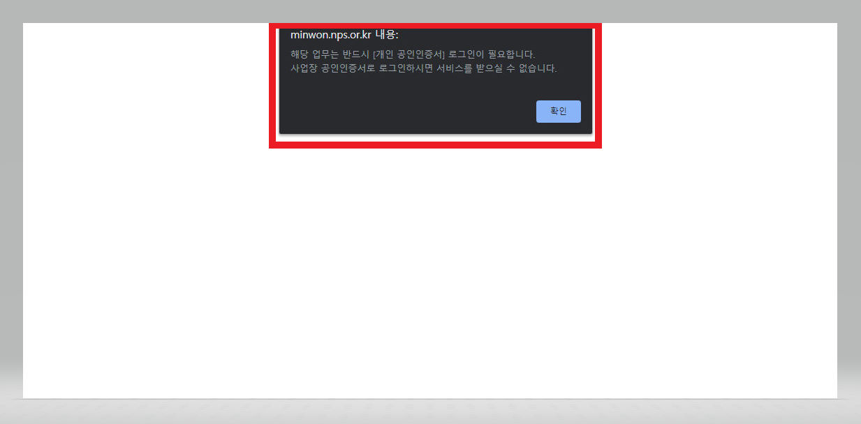 ▼ 그러면 아래처럼 [해당 업무는 반드시 개인 공인인증서 로그인이 필요합니다]라는 메시지가 뜬다. [확인] 버튼을 클릭해준다.