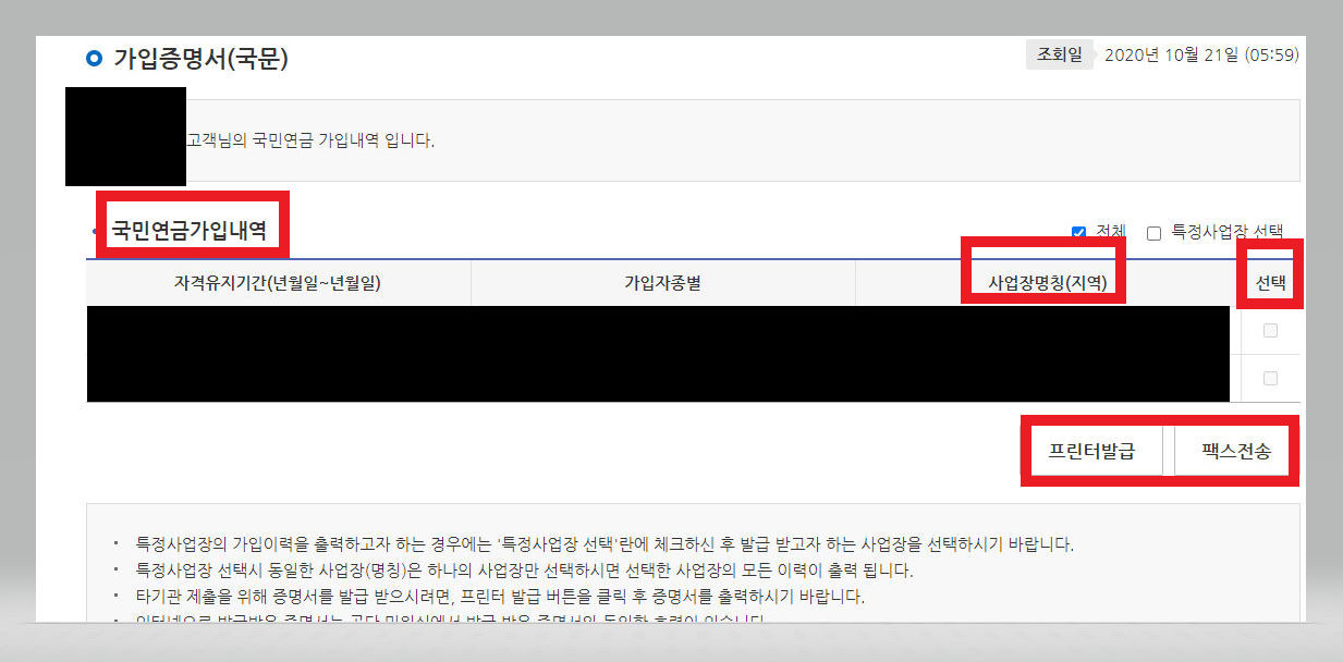 ▼ [국민연금가입내역]이 뜨는데 이 내역은 현재까지 본인이 납부를 하였던 국민연금 가입내역이다. 그 중에서 본인이 현재 재직을 하고 있는 회사를 [선택]란의 체크표시를 통해 체크해준다. 체크표시가 안 되면, 화면 우측에 [전체] 선택란과 [특정사업장 선택]란이 있는데 그 중에서 [특정사업장 선택]을 체크해준 다음 진행해보자.