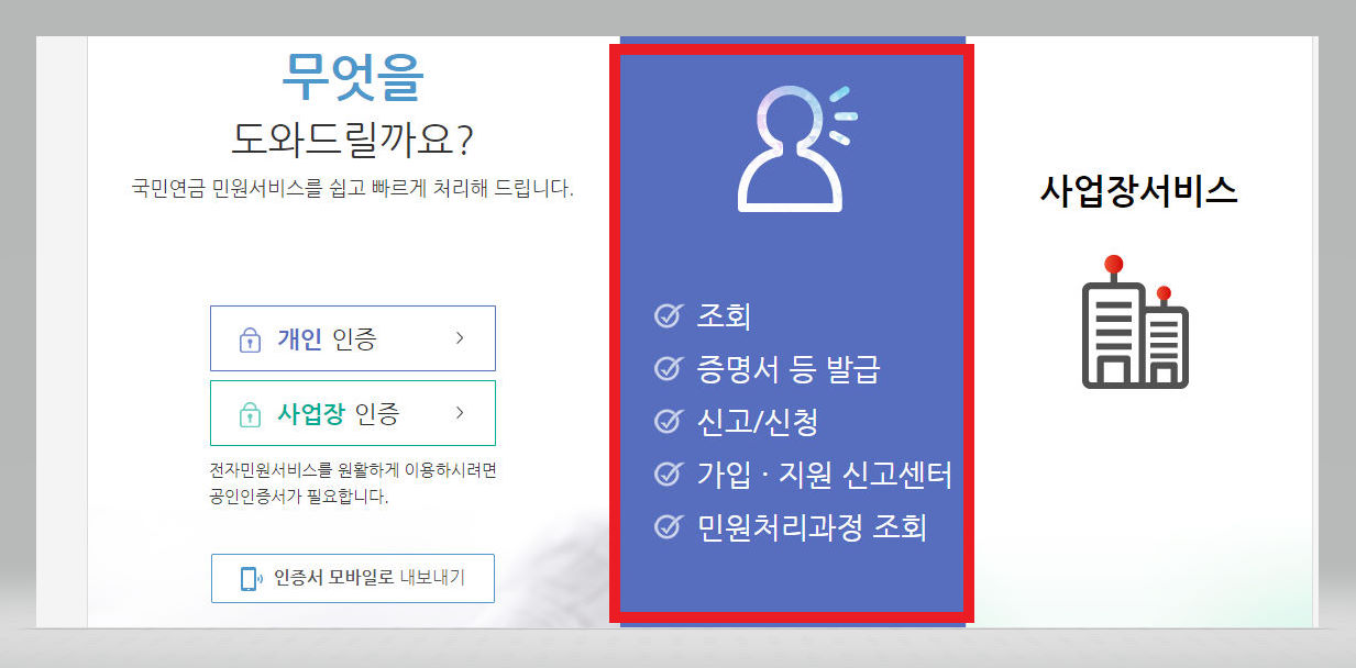 ▼ 그렇게 하면 아래와 같은 창이 뜨는데 개인서비스를 원할 경우 [개인서비스] 버튼을, 사업장서비스를 원할 경우 [사업장서비스] 버튼을 클릭해준다. 조금 전처럼 [증명서 등 발급] 메뉴를 클릭한 다음 [가입증명서(국/영문)] 버튼을 클릭해준다.