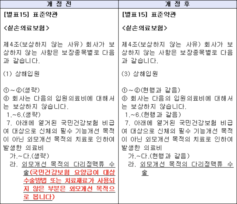그런데 기존에는 '국민건강보험 요양급여 대상 수술 방법 또는 치료재료가 사용되지 않은 부분은 외모개선 목적으로 본다'라는 단서가 달려있었다. 즉, 하지정맥류 수술 그 자체가 실손보험 보장 항목에서 빠진다는 소리다.