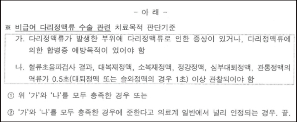 1) 다리정맥류가 발생한 부위에 다리정맥류로 인한 증상이 있거나, 다리정맥류에 의한 합병증 예방 목적이 있어야 한다 2) 혈류 초음파검사 결과 대복재정맥, 소복재정맥, 정강정맥, 심부대퇴정맥, 관통정맥의 역류가 0.5초(대퇴정맥 또는 슬와정맥은 1초) 이상 관찰돼야 한다 등 두 가지를 모두 충족했을 때다.