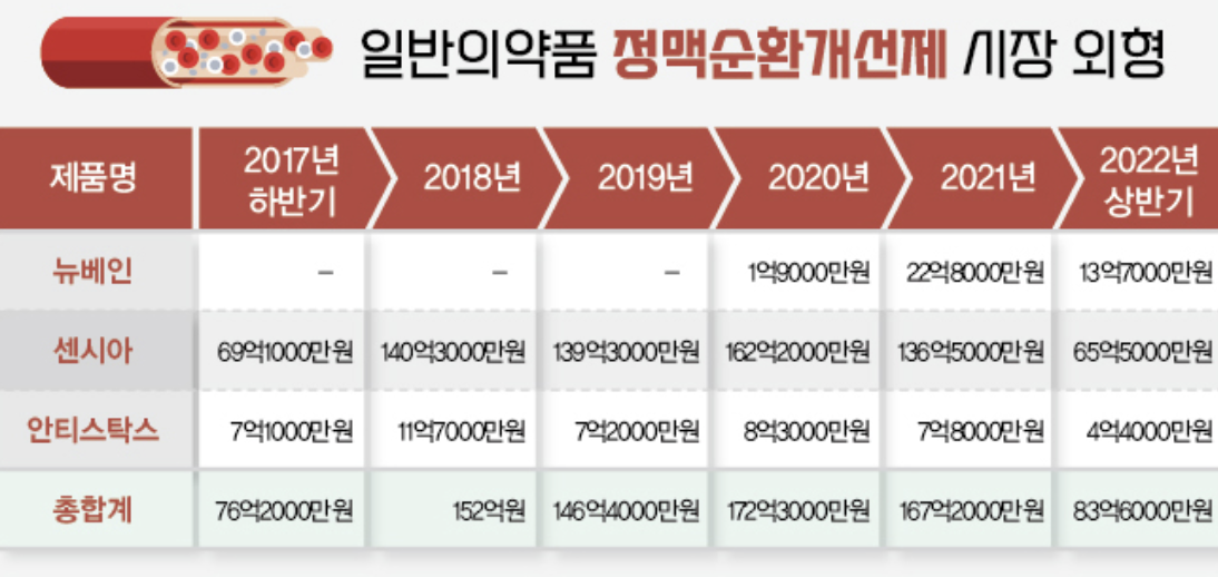 '정맥순환개선제 센시아 vs 뉴베인' 포스팅을 시작해보도록 하겠다. 200억대 외형으로 추산되는 일반의약품 정맥순환개선제 시장에서 동국제약 센시아정이 부동의 1위를 이어가고 있다.