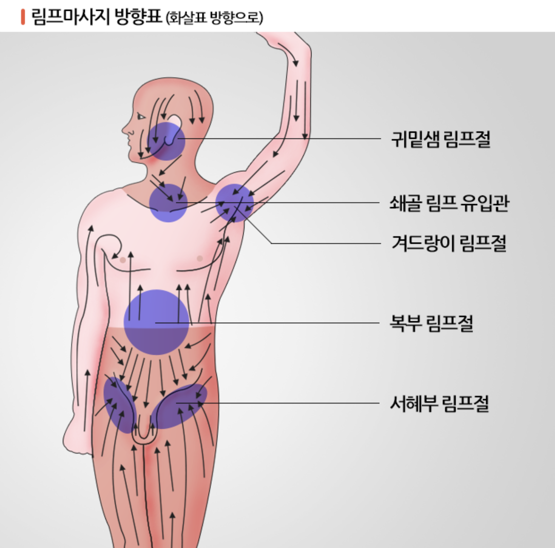 위 그림에서 파란색으로 표시된 부분이 림프절인데요. 손바닥을 밀착시켜 림프절 주변을 화살표 방향으로 쓸어내리듯 마사지해야 하면 좋습니다. 1) 머리, 얼굴, 목, 옆구리, 아랫배, 서혜부는 위에서 아래 방향 2) 윗배, 팔, 허벅지는 아래에서 위 방향 3) 겨드랑이는 양쪽 방향으로 마사지 합니다. 아침저녁으로 해주면 좋습니다.