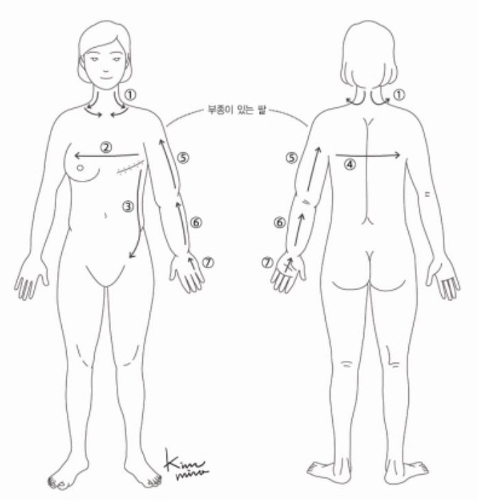 3) 부종 부위의 겨드랑이에서 같은 쪽 서혜부 방향으로 마사지해줍니다.