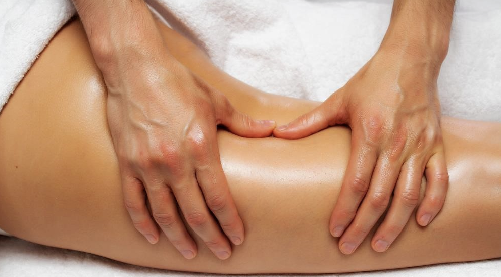 5) 무릎에서 서혜부 방향으로 허벅지를 마사지해줍니다.