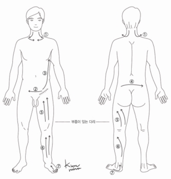 2) 부종 부위의 서혜부에서 붓지 않은 쪽 서혜부로 마사지해줍니다.