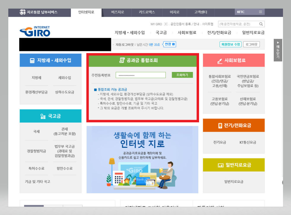전자납부번호 납부방법 3단계! 창이 하나 나타나는데, 이 창에서 전자납부번호 납부방법은 크게 두 가지로 갈린다. 우선 첫 번째 방법은 다음과 같다. 화면 중앙에 있는 [공과금 통합조회] 메뉴 아래에 [주민등록번호]를 입력한 다음 [조회하기] 버튼을 클릭해준다. 이 [공과금 통합조회] 메뉴를 통해서는 다음과 같은 공과금을 통합하여 조회해볼 수가 있다.