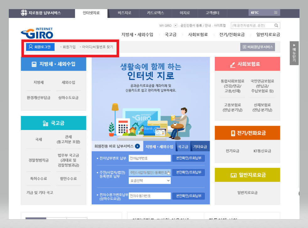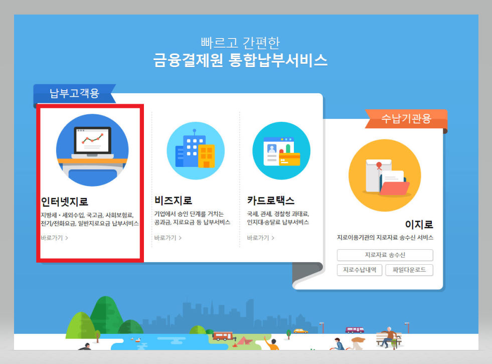 ▼ 홈페이지에 접속하면 [납부고객용] 메뉴 가운데 [인터넷지로] 버튼을 클릭해준다.