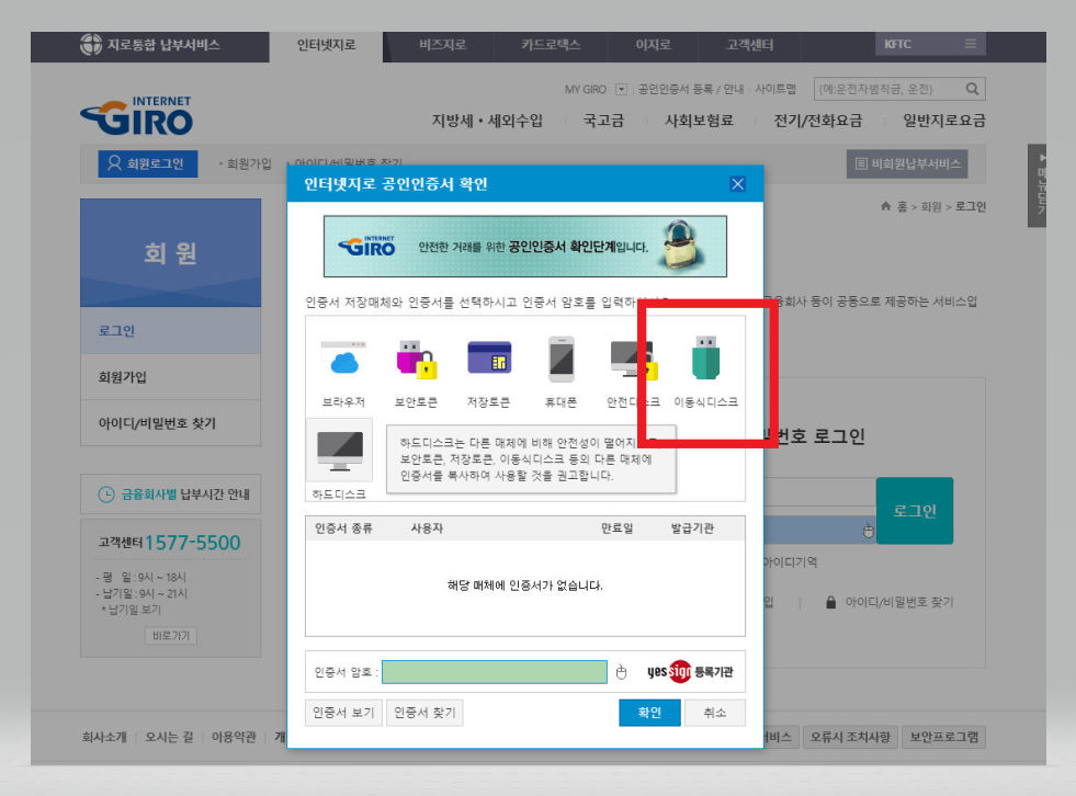 ▼ 인증서 저장매체 중 이동식디스크(USB)가 편한 이는 [이동식디스크] 버튼을, 휴대폰이 편한 이는 [휴대폰] 버튼을, 하드디스크가 편한 이는 [하드디스크] 버튼을 클릭한 다음 인증서 암호를 입력해 주도록 한다. 나의 경우는 [이동식디스크] 버튼을 클릭해주었다.