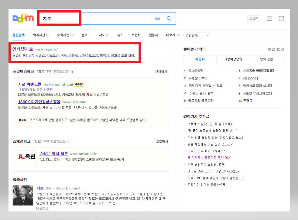 전자납부번호 납부방법 1단계! 우선 다음이나 구글 혹은 네이버 등의 검색포털에 접속하여 검색창에다가 [지로]를 검색해준다. 그런 다음 [인터넷지로] 홈페이지를 클릭해준다.