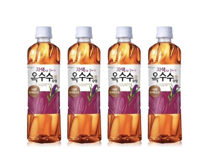 노화방지 효과가 있다는 웅진 자색 옥수수수염차다. 자색으로 잘 빠진 옥수수수염차는 '노화방지' 효능으로 알려진다. 신체 붓기와 이뇨작용을 돕는 옥수수 수염을 사용한다. 자색 옥수수를 써서 항산화 효과는 물론 진한 맛을 더했다.