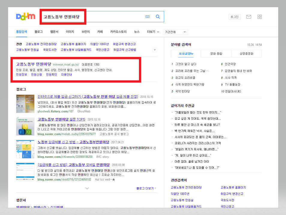 고용노동부 임금체불 신고방법 첫 번째! 우선 다음이나 구글 혹은 네이버 등의 검색포털에 접속을 한 다음 검색창에 [고용노동부 민원마당]을 입력하여 검색해준다. 그런 다음 [고용노동부 민원마당] 사이트를 클릭해준다.