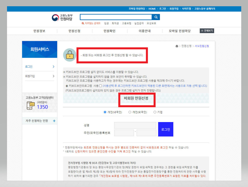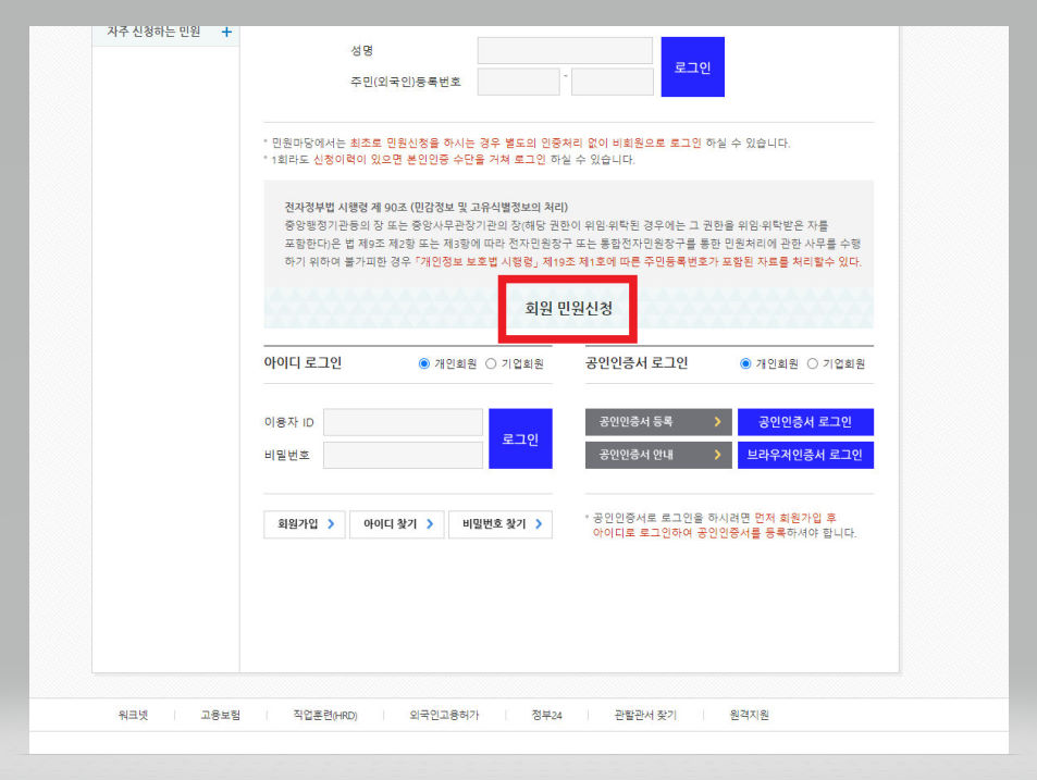 ▼ 고용노동부 임금체불 신고방법 두 번째! 로그인은 회원이든 비회원이든 상관없다. 비회원으로 로그인을 희망하는 경우 [비회원 민원신청]의 [성명]과 [주민(외국인)등록번호] 입력란에 해당 사항을 입력해준다. 회원으로 로그인하고자 하는 경우 [회원 민원신청]의 [아이디 로그인]이나 [공인인증서 로그인] 중 편한 것으로 골라 절차를 진행해주면 된다.