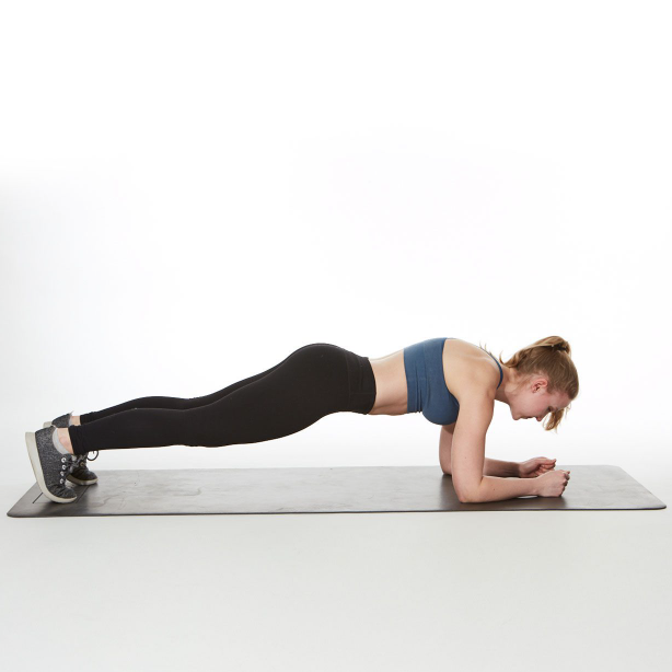 1) 매트에 무릎을 대고 앉은 자세에서 시작해, 두 다리를 뒤로 쭉 펴준다. 머리부터 상체, 하체, 발까지 일직선이 되도록 만들어주는 것이 중요하다.