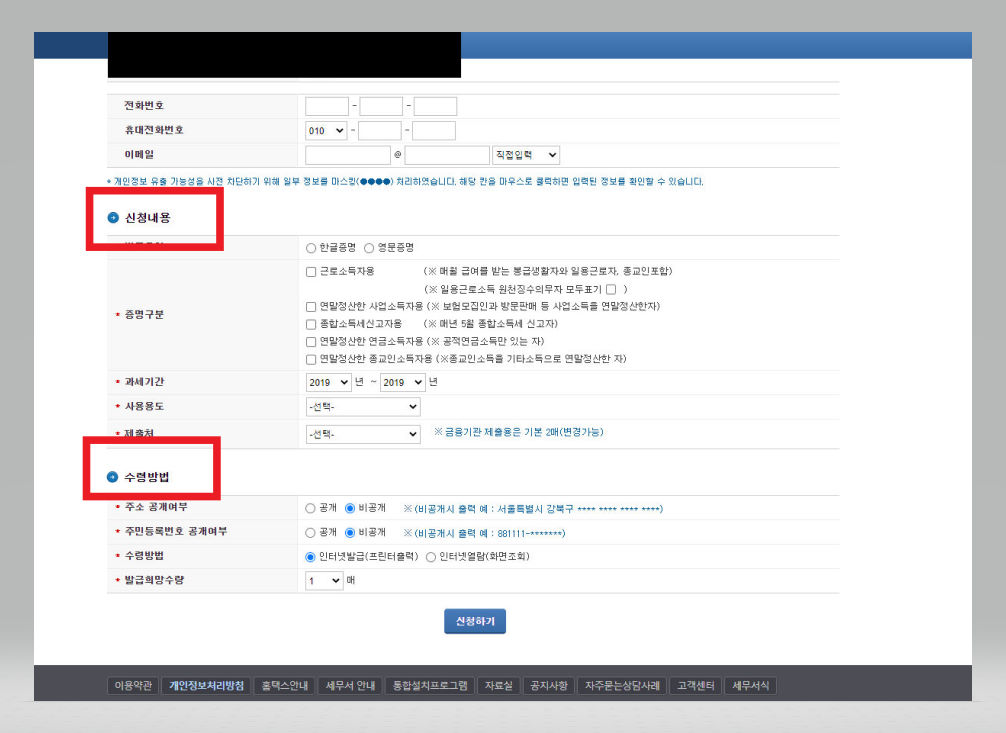 ▼ [신청내용]과 [수령방법에 해당하는 사항을 정확하게 입력해준다. [신청내용] 입력사항으로는 [발급유형]과 [증명구분], [과세기간], [사용용도] 그리고 [제출처]가 있으며 [수령방법] 입력사항으로는 [주소 공개여부]와 [주민등록번호 공개여부], [수령방법] 그리고 [발급희망수량]이 있다. 본인이 희망하는 사항대로 입력해주면 된다. 그런 다음 아래의 [신청하기] 버튼을 클릭해준다.