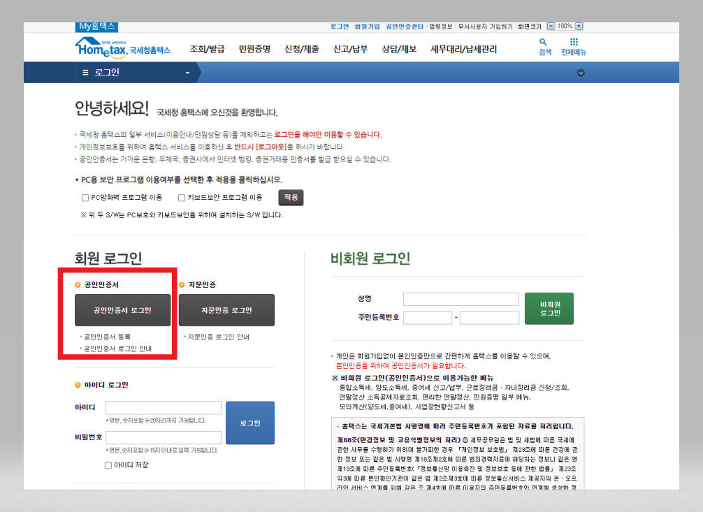 ▼ 홈택스 소득금액증명원 발급방법 2단계! [공인인증서 로그인] 버튼을 클릭하여 로그인 절차를 진행해준다.