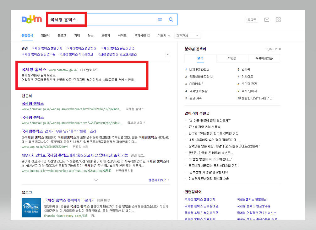 홈택스 소득금액증명원 발급방법 1단계! 우선 다음이나 구글 혹은 네이버 등 검색포털에 접속하여 검색창에 [국세청 홈택스]를 입력을 한 다음 검색해준다.